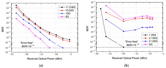 Furthermore, we explore the capability of the communication system based on the all-optical receiver for long-distance transmission over distances of 200 m and 2 km, both of which successfully demonstrated real-time transmission of uncompressed HD video signals for practical scenarios. In the 200 m transmission, as indicated by the BER curve in Figure 10a, error-free transmission is achieved at data rates of 10 Gbit/s and below. For data rates of 10.52 Gbit/s and 11.318 Gbit/s, the bit error rate was on the order of 10−9 when the received optical power (ROP) of the APD on the receiving side approached −5 dBm. On the receiving side, we use an HD display to show the real-time video signal after transmission. The system maintains stable transmission for 24 h, with the bit error rate consistently below 10−16 and the video display free of noise. When the distance is further increased to 2 km, the system is still capable of stable transmission of uncompressed HD video. BER performance degrades as shown in Figure 10b; error-free transmission is achieved only at a rate of 1.25 Gbps. BER performance at 3.125 Gbps is superior to that at 2.125 Gbps, remaining on the order of 10−8. At 5 Gbps, BER performance deteriorates to the order of 10−5. These experimental results align with the theoretical estimate that the transmission rate required for uncompressed full HD video is around 3 Gbps, and they are consistent with the system characteristics observed in previous tests.