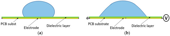 This subsection details the preparation of electrodes and the application of coating layers for optimal electrowetting performance. Initially, the electrodes on the PCB were covered with a 100 μm layer of acrylic packing tape to serve as a dielectric. A commercial multi-surface Neverwet spray was then applied as a hydrophobic layer to reduce wetting hysteresis [35]. The base coat ensured adhesion to the surface and imparted a rough texture, while the topcoat created a water-repellent layer. It is noted that the effectiveness of the Neverwet coating can diminish over time [35]. Consequently, both the dielectric and hydrophobic layers were replaced before each test.