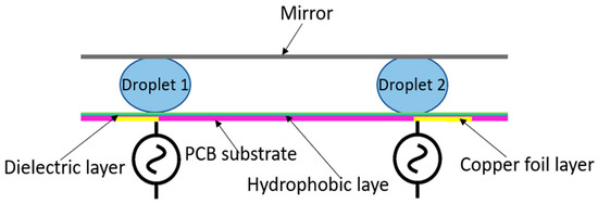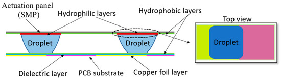 In this section of the paper, a one-dimensional model of an EWOD actuation setup that can move the SMP (actuation panel) is developed. The system is shown in Figure 3. Electrodes exist in the PCB substrate and are covered by a dielectric layer. On top of the dielectric layer, a hydrophobic layer is placed. Droplets are placed into confined positions and the actuation panel rests on top of the droplets.
