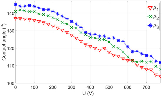 A DI water droplet with a volume of 15.7 µL was deposited on the grounded electrode using an automatic syringe pump, with a grounded wire positioned at the droplet’s center. The droplet’s shape was imaged as a function of the applied voltage, and the contact angle was determined using the plugin Contact Angle of ImageJ software. All measurements were taken under ambient atmospheric conditions at room temperature. As depicted in Figure 7, the contact angle is at its maximum (137.1°) for fluid 1 when no voltage is applied. In the Young-Lippmann (YL) regime, the contact angle decreased progressively and at an increasing rate with increasing voltage. Figure 7 shows the static contact angle of the droplet as a function of the applied voltage, U. The data demonstrate the Young-Lippmann regime for U < 750 V, while for U > 750 V, the electrowetting response saturates and the contact angle stabilizes at a constant value. The solid line in Figure 7 is a fit of the YL equation to the experimental data, where the insulator thickness and was taken as a fit parameter, and can be defined as .