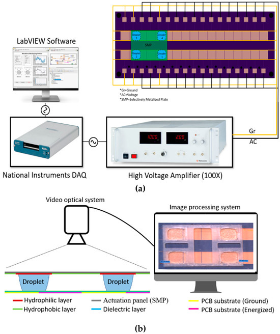 (a) The setup electrical test. In this setup, an AC voltage with an amplitude ranging between 0 and 10 V was generated at a frequency of 1 kHz using an NI USB-6343 signal generator and it is then amplified 100 times using a high voltage amplifier (Matsusada-COR-10B2). This voltage was then applied to the PCB to actuate the droplet motion. (b) Side view of the setup and electrodes with optical droplet measurement technique.