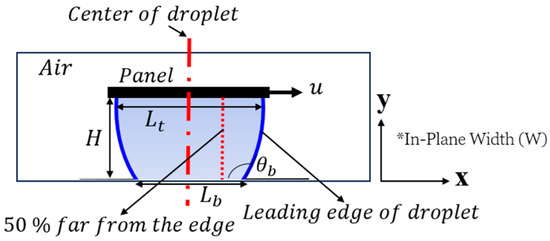 where and and ρd and ρf are the volumes and densities of the droplet and surrounding fluid, respectively, and is the area of the hydrophobic region. is the instantaneous average velocity of both the droplet and surrounding fluid, and μf is the viscosity of the drop. is a parameter that accounts for the droplet viscous effect and is the contact-line friction coefficient (molecular friction factor). Both and are parameters that need to be evaluated experimentally, and how this is conducted is explained in Section 4.