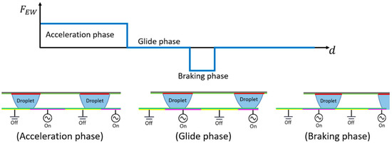 To verify the proposed analytical model (Section 2), the velocity response of the panel under applied voltages was measured experimentally. When voltage was initially applied (acceleration phase), the droplet was propelled forward by the electrowetting force. However, when the droplet completely covered the active electrode, the electrowetting force diminished to zero (glide phase), and the droplet began to decelerate due to the friction force (see Figure 10). If the droplet reaches a grounded (zero voltage) electrode, the actuation force reverses, and deceleration increases significantly (braking phase).