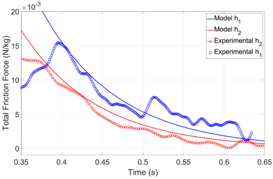 Comparison between the model’s total friction force, accounting for the internal viscous friction within the droplet () and contact line friction (), and the experimental data’s total friction force, in deceleration phase for two different heights and .
