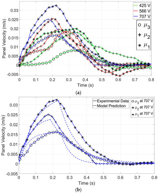 Figure 12b compares experimental data and model predictions of panel velocity as a function of time under different actuation voltages. It is evident that the model generally captures the overall trend of the panel velocity, with both the experimental and predicted data showing a rapid increase to a peak followed by a gradual decline. However, some discrepancies can be observed, particularly in the magnitude of the peak velocities and the timing of these peaks. For instance, at higher voltages (707 V and 637 V), the model predictions closely align with the experimental data, although slight underestimations are noted. In contrast, at lower voltages (566 V and 496 V), the model seems to predict the maximum velocity more accurately than at higher voltages. Currently, the maximum error between the peak velocity of the panel in the experiments and the model is 7.8%, which can be reduced by limiting the working voltage range.