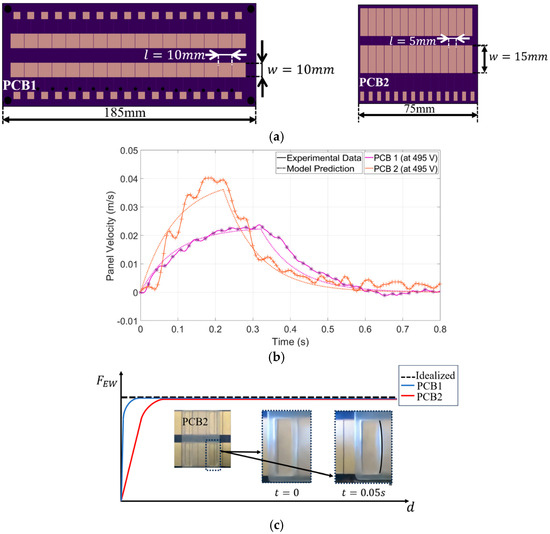 (a) Electrodes patterns for two different PCB designs; (b) the idealized and ramped electrowetting force for wider droplet (PCB2); (c) comparison of panel velocity driven by electrowetting force for PCB1 (10 mm width) and PCB2 (15 mm width) at 495 V.