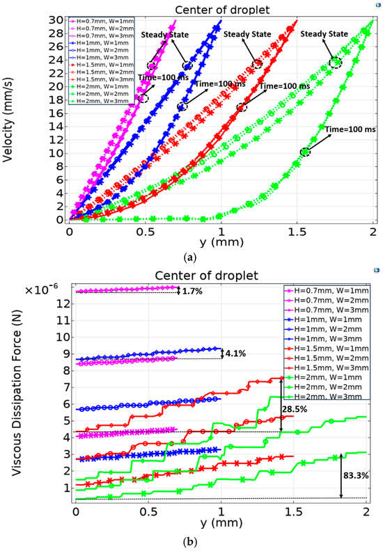 (a) Droplet fluid velocity profile as a function of a gap under different maximum height and width configurations. (b) Viscous dissipation force of droplet as a function of gap under different maximum height and width configurations. The ‘y’ coordinate represents the distance from the substrate.