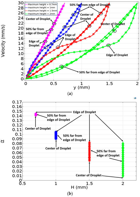 This figure also shows that the width of the droplet does not affect the velocity profile at the center of the plate as much as the height does, with this effect approaching zero for a height less than 1 mm. Therefore, it is helpful to choose parameters that maintain linearity in the system. The simulation shows that if the droplet’s height-to-width ratio is below 0.05 (H/W = 0.05) the system’s behavior is highly linear and, thus, more predictable.