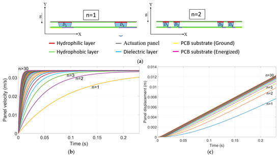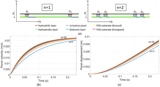 Case 1: Figure 18a shows the schematic diagram illustrating the configuration of droplets positioned on a hydrophobic layer beneath an actuation panel, driven by electrowetting forces. As the number of droplets increases, the length of the plate also increases by 1.4 L for each additional droplet (where L is the length of the droplet in the wetted section). A factor of 1.4 L is considered to prevent the merging of droplets. Additional experiments are needed to precisely determine the critical gap between two droplets as a function of droplet volume and wetting area to prevent merging. In addition, the number of active electrodes also increases, so the electrowetting force is augmented, resulting in an initial increase in the panel’s velocity. In the current simulation, each droplet has a volume of 240 μL, and with each step, n, four new droplets and four new active electrodes are added to the system. As more droplets are added, the system’s mass (both droplets and plate mass) and the corresponding drag force also increase, leading to a point where additional droplets no longer contribute to a significant rise in velocity. This effect is clearly illustrated in the velocity-time plot (Figure 18b). The simulation shows that at a specific time, such as 0.1 s for (n = 5) (with a total volume of 4.8 mL), the panel reaches 90% of its maximum speed while using 50% less droplets compared to (n = 10). Adding more droplets beyond this point increases complexity without significant performance gains. Additionally, the plot indicates that at 0.1 s, increasing the number of droplets from (n = 1) to (n = 2) results in only a slight velocity increase of less than 14%, while introducing considerable challenges, such as merging issues and fabrication difficulties. The displacement plot (Figure 18c) shows that increasing the number of droplets initially results in a steeper rise in panel displacement, as the augmented electrowetting force leads to faster acceleration. However, all configurations tend towards the same steady-state velocity, indicating that the greatest benefit of additional droplets is observed in short actuation periods, where the panel does not reach a steady state. Higher droplet counts (e.g., n > 10) show greater displacement than lower counts like (n = 1), but the differences diminish over time as the system reaches steady-state velocity. This highlights the advantage of optimizing the droplet count specifically for applications involving brief actuation periods, where quick acceleration is needed without the panel fully settling. This plateau highlights the importance of optimizing droplet count to achieve the desired displacement without unnecessarily increasing system complexity and fabrication challenges.