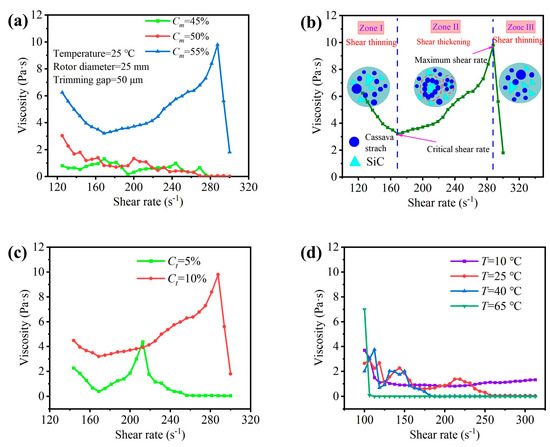 Figure 4. Fluid viscosity as a function of shear rate at (a) different cassava starch concentrations, (c) abrasive particle concentrations, and (d) temperature. (b) shows the different viscosity regimes of the STF ( C m = 55%, C t = 10%, and T = 25 °C).