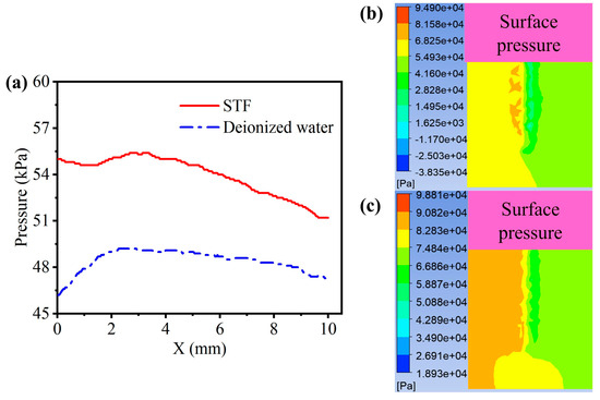 Figure 6. (a) Pressure curve along the centerline of the workpiece surface, and the pressure contour at the workpiece surface in (b) the deionized water and (c) the STF calculated through numerical simulations.