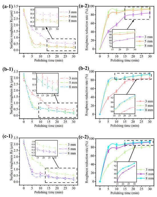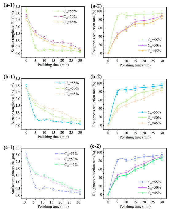 Figure 7 presents the roughness variation curves from the polishing on different surface geometries by using the STF solution at ω = 1000 rpm. The solution was prepared with C t = 10%, coupled with different concentrations of cassava starch at C m = 45%, 50%, and 55%. During the polishing process, the feed depth was set at d = 8 mm. The rheological tests in the previous section reveal that the shear-thickening behavior is observed at C m = 55%, while it does not occur at C m = 45% and 50%. It can be seen that the roughness of the polished surface decreases as the cassava starch concentration increases. The decrease rate in roughness is faster in the first 5 min of the polishing process. The roughness curves exhibit a declining trend. It indicates that the surface roughness is gradually improved during the polishing operation with the fiber brush. Due to the shear-thickening effect, the surface roughness exhibits a rapid decrease within a polishing duration of 5 min, achieving a reduction of approximately 80%. Compared with the results of shear-thickening polishing in the reference literature [19], we found that there is a slight difference in the optimal range of starch concentration. This may be due to the different types and molecular structures of starch used in different experiments. And, the decrease in surface roughness is increased by about 10%. In the absence of a shear-thickening effect, the decrease in surface roughness, observed across both planar and curved interfaces, is confined to approximately 40%, indicating a limited improvement in surface smoothness. Initially, there are numerous scratches on the raw workpiece surface. The agglomerated particles due to the shear-thickening effect are able to effectively remove these irregularities. This leads to a large initial reduction in the surface roughness. Under shear-thickening enhancement for a duration of 30 min, the surface roughness is remarkably reduced. In particular, the surface roughness decreases from 3.125 μm to 0.312 μm for the flat surface (Figure 7(a-1)), from 3.098 μm to 0.353 μm for the concave surface (Figure 7(b-1)), and from 3.257 μm to 0.324 μm for the convex surface (Figure 7(c-1)). These mean improvement in the surface quality for all the workpiece geometries, exceeding those without the assistance of the shear-thickening effect. The effectiveness of this approach is evident in the significant refinement of the workpiece surfaces, underscoring its potential to improve the surface roughness accuracy and overall surface finish.