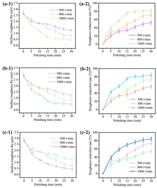 Figure 8. Influence of the polishing speed on the surface roughness and its reduction rate for different surface geometries: (a) plane surface, (b) concave surface, and (c) convex surface.