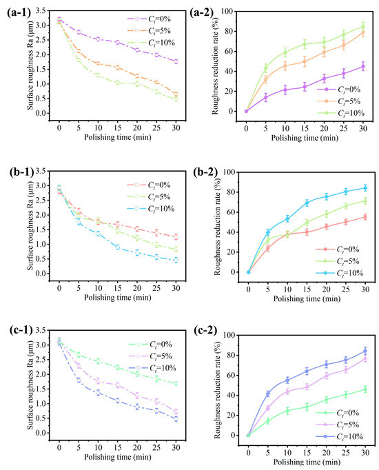Figure 10 presents the evolution profile of surface roughness for different abrasive concentrations at ω = 1000 rpm and d = 3 mm. The STF slurry with C m = 55% was prepared at different abrasive concentrations, C t = 0%, 5%, and 10%. Within 30 min, the surface roughness showed an overall decreasing trend. The increase in the abrasive concentration led to improved polishing accuracy. Specifically, at C t = 10% the reduction rate of surface roughness exceeded 40% within 5 min, and the surface roughness during the polishing of 30 min reached about 0.5 μm, which was significantly higher than C t = 5% and without abrasive particles. Compared with the reference [22], adding abrasive particles to the polishing solution significantly accelerated the material removal rate, increasing it by about 50%. And, as the concentration of abrasive particles increased, the removal rate also accelerated, and the surface accuracy that could be achieved also improved. The increase in abrasive concentration improves the participation of abrasive particles in the polishing process and promotes the formation of more particle clusters under high shear conditions. In addition, increasing the abrasive concentration also helps to form denser aggregates, which enhances the polishing effect on the workpiece surface due to stronger grinding action.