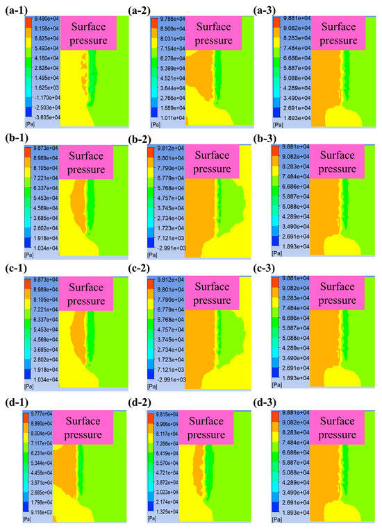 Figure 11. Surface pressure contours at different starch concentrations: (a-1) 45%, (a-2) 50%, and (a-3) 55%; at different polishing speeds: (b-1) 500 rpm, (b-2) 800 rpm, and (b-3) 1000 rpm; at different feed depths: (c-1) 3 mm, (c-2) 5 mm, and (c-3) 8 mm; and at different abrasive concentrations: (d-1) grainless, (d-2) 5%, and (d-3) 10%.