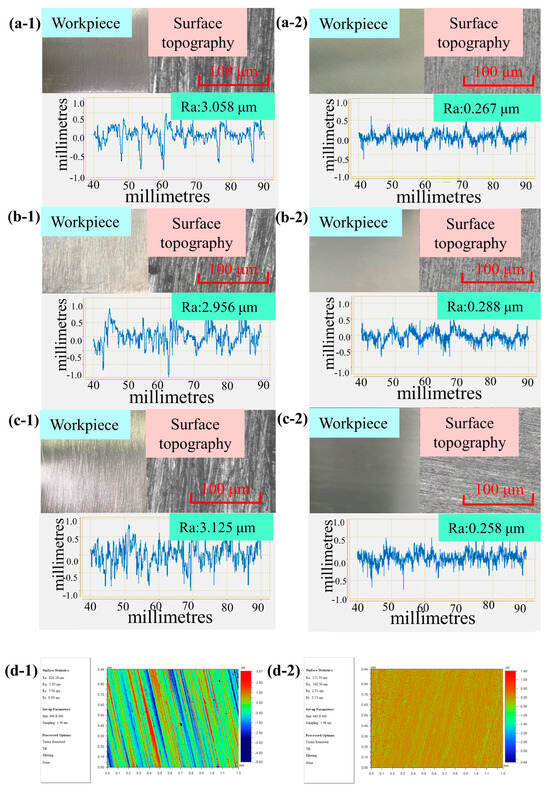 Figure 12. Surface topography (left) before and (right) after polishing for different surface geometries: (a) plane surface, (b) concave surface, (c) convex surface ( C t = 10%, C m = 55%, ω = 1000 rpm, and d = 8 mm), and (d) two-dimensional micro-morphologies of workpiece surfaces (d-1) before and (d-2) after polishing under experimental conditions: C t = 10%, C m = 55%, ω = 1000 rpm, and d = 8 mm.