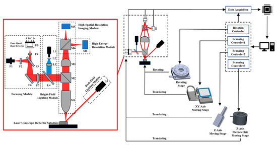 Figure 11, with a focus on the optical inspection subsystem, including the focusing module, detector module, two beam splitters, and illumination module. The adjustment components were provided for each part’s precise adjustment, as described in