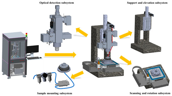 Figure 1. Motion apparatus control by the host computer orchestrates the optical instrument’s scanning and focusing operations. Subsequently, the test sample translation along a predetermined trajectory is orchestrated by the loading platform manipulation. The conversion of each detection surface signal into an electrical counterpart is executed by the detector. Afterward, these signals are transmitted to the main computer through a data collector for subsequent image-processing stages.