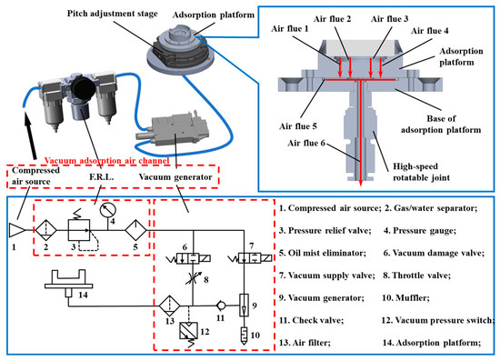 Figure 4). The F.R.L. was utilized to remove particles and oil contaminants from the air. The vacuum generator (SMC, Japan, maximum vacuum degree −90 kPa) was utilized to create a vacuum environment. The airflow direction in the channel is managed using vacuum activation and deactivation valves (both being electromagnetic). Upon opening the vacuum activation valve and closing the vacuum deactivation valve, the vacuum producer becomes linked to the compressed air, slowly removing air from within the chuck to establish a vacuum, resulting in the chip being held by suction. Alternatively, if the vacuum release valve is open while the vacuum supply valve is shut, the chuck becomes linked to the compressed air through a throttling valve, which removes the vacuum inside and allows the chip to be released progressively. This seamless adsorption and release process minimizes the stress applied during handling.