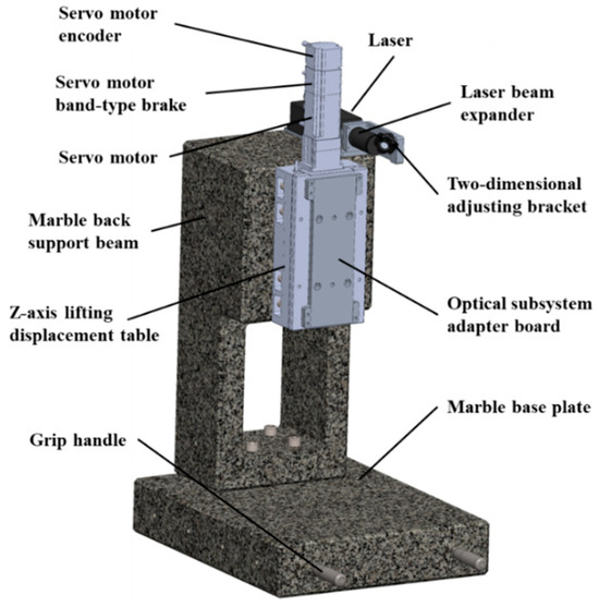 The support and elevation subsystem utilizes a marble fixed beam configuration to support the lifting platform, which is moved by the optical engine system. Simultaneously, the lifting platform is equipped with a brake electromagnetic coil, encoder feedback signals, and a drive motor. The brake electromagnetic coil is employed to brake the motor, preventing collision or overspeed situations between the motor carrying the optical inspection subsystem and the sample. The lifting platform (Akribis, Singapore) is equipped with grating rulers, providing feedback signals through encoders to the main control computer to determine the motor positioning accuracy. The drive motor (rated power of 0.1 kW, rated torque of 0.32 Nm, maximum torque of 0.96 Nm, rotor inertia of 0.5 × 10