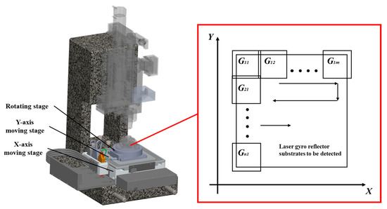 The experimental setup was based on a planar scanning methodology, wherein the detection surface traverses the designated test area by displacing the specimen under examination. This methodology facilitates the defect detection on the surface and periphery of the reflector substrate employed in the laser gyro system, as depicted schematically in