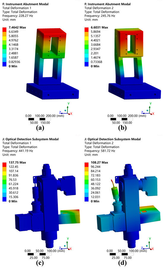 According to the simulation outcomes, the instrument’s base frequency was 228.27 Hz, while that of the optical inspection subsystem was 441.19 Hz. The entire system’s integrated fundamental frequency was no less than the lower of these two, which was 228.27 Hz, and thus, met the design requirements. The structure demonstrated excellent dynamic stiffness.