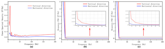 Figure 9a, the input power spectral density was set in the vertical and horizontal directions for the structure by utilizing the modal superposition method to extract the natural frequencies and mode shape results obtained from the modal analysis in