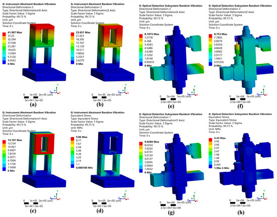 In the simulated results, under harsh transportation conditions, the optical inspection subsystem experienced a maximum deformation of 9.02 μm in all directions, while the maximum deformation of the instrument base reached 41.907 μm. This may lead to changes in the performance of the instrument during transportation, thus requiring reinforcement and fixation of the base rear during transportation. The maximum stress on the instrument base (9.86 MPa) occurred at the support beam, while the maximum stress on the optical inspection subsystem (4.45 MPa) occurred at the mounting angle; both deformations fell within the materials’ acceptable stress limits, which satisfied the design specifications.