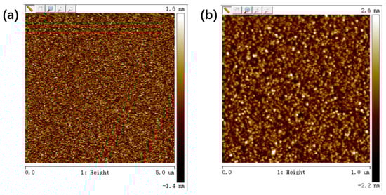 AFM images of AlN films with areas of (a) 5 × 5 µm2 and (b) 1 × 1 µm2. Their root mean square roughnesses are 0.430 nm and 0.677 nm, respectively.