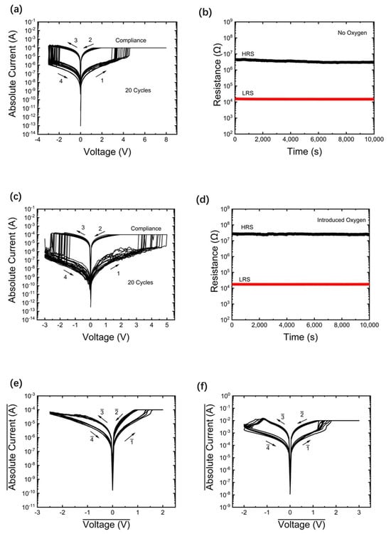 It is noteworthy that our new device exhibits excellent consistency in the BRS curve. The set voltage is approximately 4 V, and the reset voltage is about −2.0 V. The retention test shown in Figure 4d follows the standard procedure for non-volatile memory technology. The memristor is first switched to either LRS or HRS, and its resistance is repeatedly measured by applying a 0.1 V reading voltage at room temperature. After the measurement, the memristor also demonstrates excellent non-volatility. According to Figure 4d, the switching window of the device is approximately 2 × 103. It can be observed that the device increases the switching window of the memristor without altering its cycling characteristics, thereby significantly enhancing the performance of the memristor.