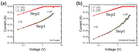 As shown in Figure 5, the resistance switching mechanism is studied by analyzing the current transmission in step 1 and step 2 of the double logarithmic graph of the typical I-V curve. As shown in Figure 5a,b, during the voltage scanning in step 1, it is observed that the current voltage is in a linear ohmic relationship at low to a medium bias voltage (<0.5 V), that is, I∝V. Then, when the voltage sweep is close to 3.0 V, the current voltage relationship is quadratic, that is, I∝V2. A sharp increase in current was observed at 3.5 V (VSET), and then the secondary current voltage behavior reappeared until the current was clamped by the compliance setting. Trap-related space charge limiting current (SCLC) has aptly described this current transport mechanism, and VSET corresponds to the voltage at which all traps in AlN are filled with injected carriers. Therefore, we believe that the resistance switching mechanism in our devices is due to the trap-related SCLC mechanism. In step 1 of VSET, the complete filling of these traps causes the device resistance to change from HRS to LRS, while in step 2, the release of these traps causes the device resistance to change from LRS to HRS. From the results of material analysis, AlN film is the provider of nitrogen ions, and this process will leave a large number of nitrogen vacancies in AlN film. These point defects in AlN film may play the role of trap center, which leads to bipolar resistance switching of devices through the SCLC mechanism.