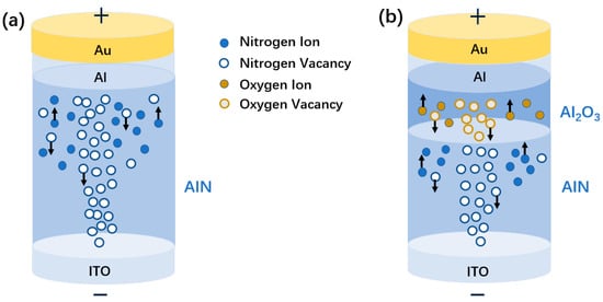 Schematic diagram of the bipolar IV switch process of (a) the Au/Al/AlN/ITO device and (b) the Au/Al/Al2O3/AlN/ITO device.