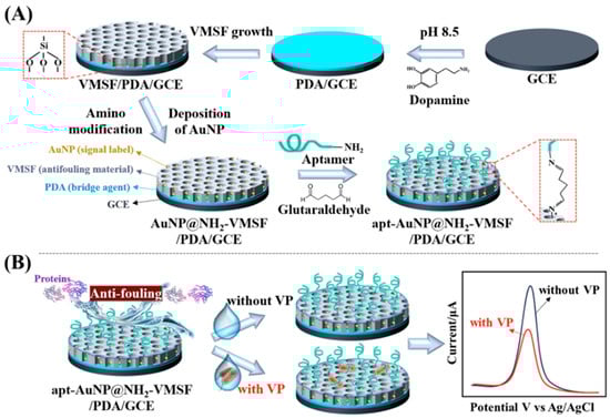 - Jin, X.; Gong, L.; Liang, J.; Wang, Z.; Wang, K.; Yang, T.; Zeng, H. Polydopamine-Enhanced Vertically-Ordered Mesoporous Silica Film Anti-Fouling Electrochemical Aptasensor for Indicator-Free Vibrio Parahaemolyticus Discrimination Using Stable Inherent Au Signal. Sens. Actuators B Chem. 2024, 407, 135485. [Google Scholar] [CrossRef]