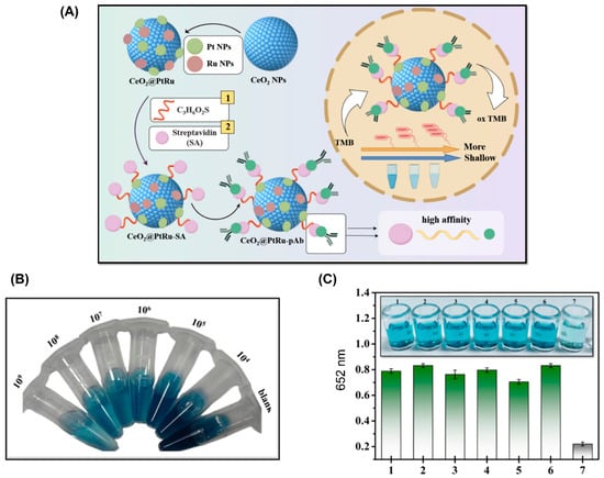 - Xu, C.; Xie, J.; Yu, L.; Shu, B.; Liu, X.; Chen, S.; Li, Q.; Qi, S.; Zhao, S. Sensitive Colorimetric Detection of Vibrio Vulnificus Based on Target-Induced Shielding against the Peroxidase-Mimicking Activity of CeO2@PtRu Nanozyme. Food Chem. 2024, 454, 139757. [Google Scholar] [CrossRef] [PubMed]