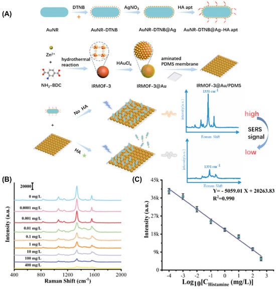 - Pan, Y.; Xu, S.; Wang, Z.; Jiang, C.; Ma, X. Sensitive SERS Aptasensor for Histamine Detection Based on Au/Ag Nanorods and IRMOF-3@Au Based Flexible PDMS Membrane. Anal. Chim. Acta 2024, 1288, 342147. [Google Scholar] [CrossRef]