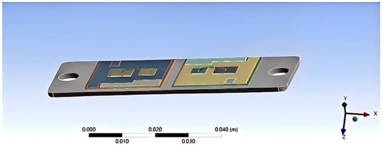 This study employs the geometric model parameters of Infineon’s FF50R12RT4 module. The dimensions were obtained through reference to manuals and textbooks, as well as with the aid of a micrometer. The material properties were provided by ANSYS Workbench’s built-in material library. The model was created using AutoCAD software (2022), consisting of an IGBT chip, diodes, a solder layer connecting the chip to the copper substrate, a copper plate, a ceramic layer, another solder layer, and a copper base [28]. Upon importing the IGBT model, the densities and thermal conductivities of various materials were set. With reference to Figure 1, the pertinent parameters are shown in Table 1 and Table 2.