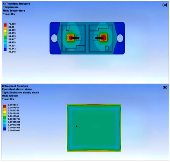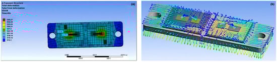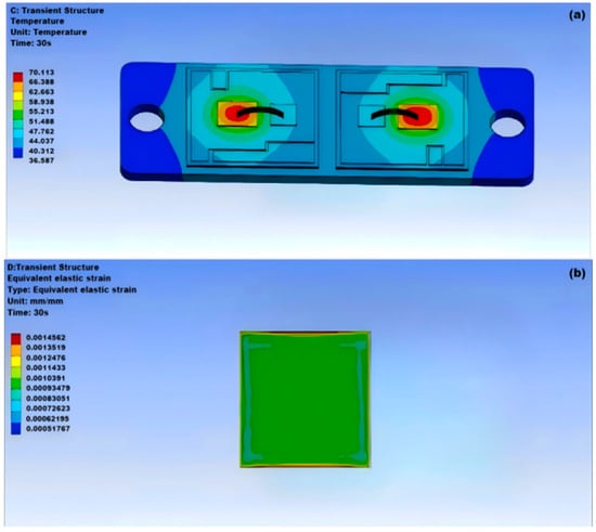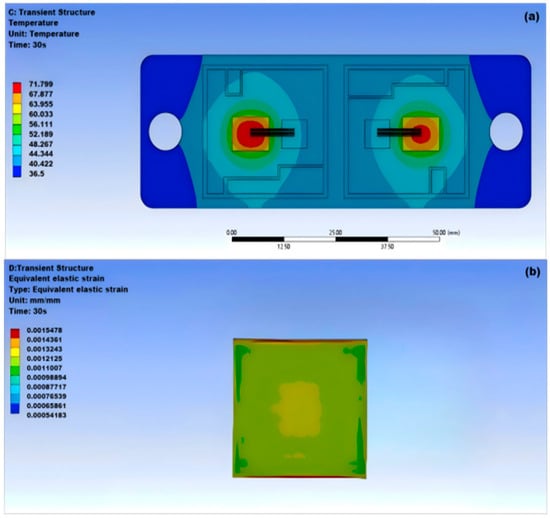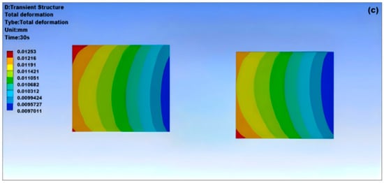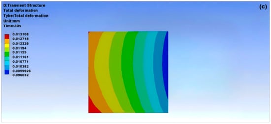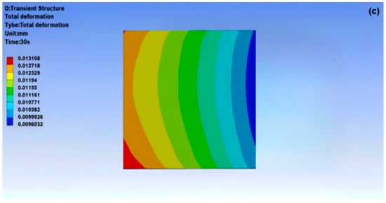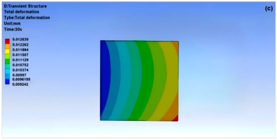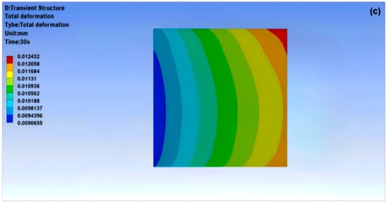 Nanosilver solder is a type of welding material composed of nanosilver particles and several additives. It has good electrical and thermal conductivity, making it suitable for the production and assembly of electronic devices. As shown in Figure 3a, the highest temperature appears at the center of the solder layer at 68.016 °C, while the lowest temperature at the edge is 36.511 °C; as shown in Figure 3b,c, the module deformation amount is small and changes uniformly.