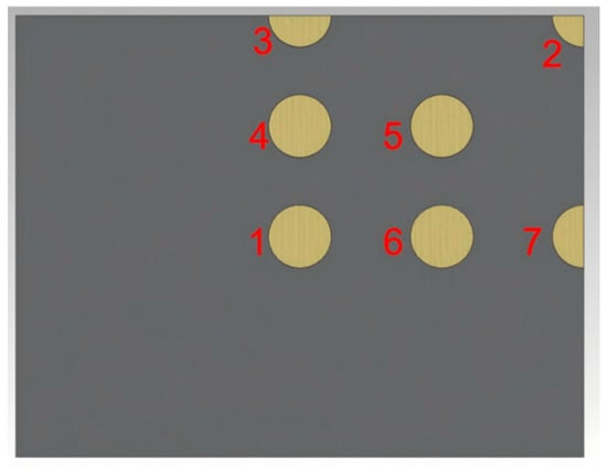 As shown in Figure 8, there are seven points with cavity damage in the IGBT. To better compare the temperature and stress changes caused by cavity damage, representative edge cavity positions 2 and 7, and central cavity positions 1 and 4, were selected for comparative analysis. These holes reflect the real defects that may appear within the solder layer under normal working conditions. Analyzing the temperature and stress changes in the module caused by void damage at different positions can help better protect and care for the IGBT modules by comparing the magnitude of the impacts.