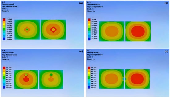 Temperature cloud map of solder layer at various cavity positions of IGBT: (a) cavity 1; (b) cavity 2; (c) cavity 4; (d) cavity 7.