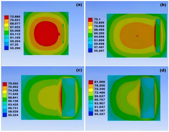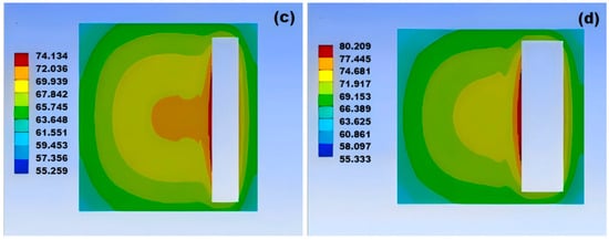 Temperature variation contour map of through-hole welding with increasing cavity size: (a) temperature variation contour map for 0.3 mm cavity; (b) temperature variation contour map for 0.5 mm cavity; (c) temperature variation contour map for 0.7 mm cavity; (d) temperature variation contour map for 1 mm cavity.