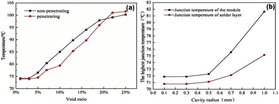 As shown in Figure 13a,b, when the porosity is at 5% or the cavity radius is below 0.5 mm, the temperature variation of the solder layer remains stable, indicating that the thermal behavior of the IGBT is not significantly affected. Therefore, the porosity of the IGBT module should ideally be controlled at 5% and the cavity radius below 0.5 mm. When the porosity varies in the range of 5% to 20%, the temperature of the IGBT module increases with the rise in porosity and cavity radius, which greatly affects the operational performance of the module.