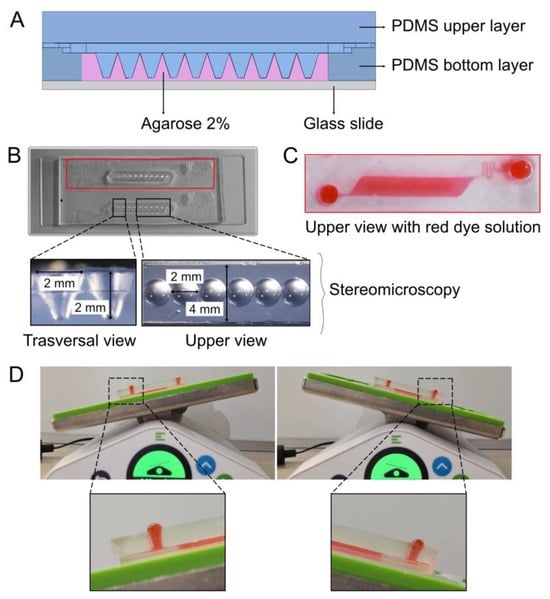 The microfluidic device comprises two layers of polydimethylsiloxane (PDMS): a bottom layer housing two spheroid culture chambers bonded to a glass slide, and an upper layer with the culture medium reservoir. PDMS was selected for its advantageous properties, including elasticity, optical transparency, biocompatibility, low autofluorescence, thermal and chemical stability, patterning technologies like replica molding, and soft lithography [54]. Combined with rapid prototyping, this enables swift, cost-effective development of microfluidic structures [55]. The bottom layer was fabricated from a 3D printed master mold (ceramic-like Perform material) by using standard soft lithography. The mold design was created in Autodesk® Inventor Professional 2024 software and then it was 3D-printed by stereolithography. Briefly, PDMS and a curing agent were mixed at a 10:1 w/w ratio, degassed, and poured on the master mold. After 3 h curing at 60 °C, the PDMS layer was detached from the 3D master mold and bonded to a glass slide by plasma bonding using a plasma bonding pen. The bottom layer contains the culture chamber and microfluidic channels connecting the culture chamber to medium reservoirs. The upper layer was obtained by pouring the PDMS solution onto a flat surface. After 3 h curing at 60°, the PDMS layer was peeled off from the flat surface, cut with the same dimension of the bottom layer, and punched with a 4 mm biopsy punch to obtain the culture medium reservoirs. Prior to bonding the two PDMS layers, an agarose solution (2% w/w in PBS, low-melting-point agarose) was loaded into the culture chamber of the bottom layer to obtain a micropatterned surface thanks to another 3D-printed master mold to favor cell aggregation and spheroid formation. We chose agarose as the hydrogel to use in our system because it facilitates the diffusion of nutrients, oxygen, and metabolites during cell culture [56] and enables easy inverse gelation modeling to create conical microwells. When introduced above 50 °C, agarose can be molded and cooled, retaining its microstructured pattern, which is essential for spheroid cell culture incubation. The agarose mold was designed with cone-shaped microwells (10 wells/culture chamber) in Autodesk Inventor, 3D-printed via stereolithography (Protolabs), and placed on the bottom layer with wells facing downward. Liquid agarose (2% w/w in PBS) was dispensed through a hole in the mold, cured at −20 °C for 5 min, and the mold was removed. Dimensions of 2 mm deep and width per cone were verified by stereomicroscopy (SM Z18, 1× and 2× objectives). The agarose structure was then washed with antibiotic solution (20 U/mL penicillin, 100 mg/mL streptomycin solution in 5% v/v in PBS). The PDMS layers were bonded using uncured PDMS as glue, as previously described [19]. The glue (10:1 PDMS–curing agent w/w) was spin-coated on a 50 × 70 mm glass slide at 2000 rpm for 200 s. Both PDMS layers were brought into contact with the uncured glue and each other. The assembled chip was left in a humid environment at 37 °C 48 h for glue to cross-link. Pre-use sterilization occurred under UV light for 1 h.