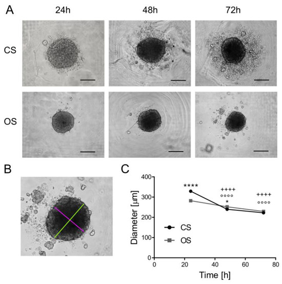To monitor the growth kinetics of OS and CS spheroids over time, daily transmitted light microscopy images of spheroids were captured (objective 10×). Spheroid diameter measurements were obtained with ImageJ software (version 1.8.0, U.S. National Institute of Health, Bethesda, MD, USA) using maximum and minimum diameters and the calculated medium diameters at different time points after seeding and in different conditions, with 20 spheroids (5.000 cells/well) for each condition.