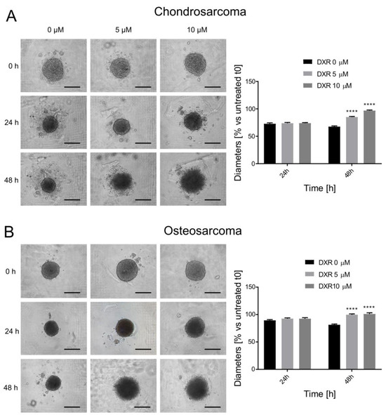 Drug screening assay based on transmitted light images of treated OS (A) and CS (B) spheroids. On the left, representative images of spheroids before DXR treatment (0 h) and after treatment (24 h and 48 h) at different doses (0–5–10 μM). Magnification 10×, scale bar 200 μm. On the right, graphs of the percentage of DXR-treated spheroid size in respect to untreated spheroids (treated vs. untreated, **** p < 0.0001).