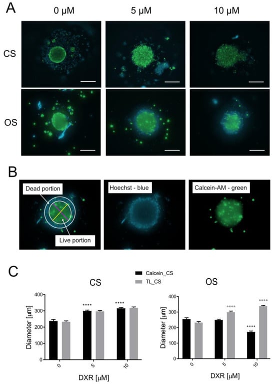 To evaluate OS and CS spheroid responsiveness to DXR treatment, spheroids were stained with fluorescent dyes 48 h post-DXR and imaged using an ImageXpress PICO high-throughput automatic imaging system (objective 4×). This system enables simultaneous imaging of the entire spheroid chamber (n = 10 spheroids) in under 10 min. Spheroids were stained with a solution of calcein AM (live cells, 5 µg/mL) and Hoechst 33342 (0.125 μg/mL, nuclear staining, live and dead cells). Spheroids (n = 10 per condition) were incubated with 200 µL of staining solution for 40 min at 37 °C, protected from light.