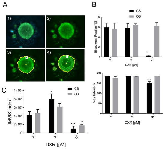 Drug screening assay based on quantification of the BAF of highest intensity range for calcein AM staining of OS and CS spheroids, treated for 48 h with DXR. (A) Schematic of method to calculate the BAF and maximum intensity: (1). load fluorescence image for NIS Elements AR 5.40.01 software analysis; (2). select green fluorescence channel: (3). select ROI, corresponding to the green-stained spheroid area; (4). define area within ROI where green channel fluorescence exceeds selected threshold. (B) Graphs showing BAF and the maximum intensity for DXR treated vs. untreated spheroids (*** p < 0.001, **** p < 0.0001). (C) Graph of IMVIS of DXR-treated spheroids, calculated by multiplying calcein AM-positive assumed volume and BFA (treated vs. untreated, * p < 0.05, *** p < 0.001, ° p < 0.05).