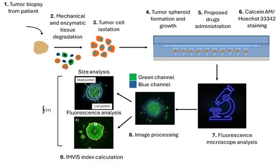 The step-by-step process envisioned for the personalized therapeutic approach, founded on our microfluidic device for generating patient-derived spheroids and their image analysis, progressing from patient’s bedside to tailored outcomes on individualized anticancer therapies. First, a biopsy is taken from the patient (1), it is mechanically and enzymatically degraded (2) and only tumor cells are isolated (3). The tumor cells are then seeded in the platform (4) to obtain spheroids from patient cells and, once the spheroids are formed, a chemotherapeutic drug is administered (5). After the treatment, a live staining is performed (6), and images are subsequently acquired using a fluorescence microscope (7), processed (8), and analyzed with IMVIS index (9) to evaluate the proportion of live and dead cells within the spheroid.