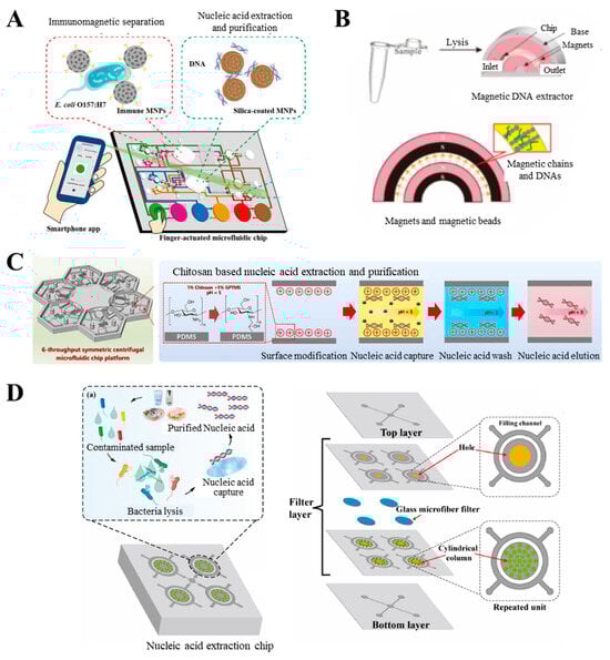 Sample preparation in microfluidic LOC devices for nucleic acid analysis. (A) Schematic diagram of immunomagnetic separation, nucleic acid extraction, and purification parts in a fully integrated microfluidic biosensor with finger actuation. Reproduced with permission from Ref. [45]. (B) The schematic for magnetic bead chain-based continuous-flow DNA extraction and the design of the concentric half-ring magnets. Reproduced with permission from Ref. [46]. (C) The centrifugal microfluidic chip and the chitosan nucleic acid extraction method. Reproduced with permission from Ref. [47]. (D) The nucleic acid extraction from bacteria on the nucleic acid extraction chip and its structure (top layer, filter layer, and bottom layer), in which the glass microfiber filter was inserted in the middle of the filter layer. Reproduced with permission from Ref. [48].