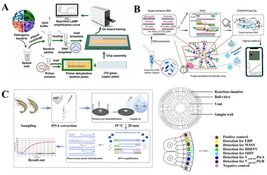 Microfluidic LOC devices for nucleic acid amplification and detection of foodborne pathogens. (A) Multiplex detection of foodborne pathogens in milk using real-time LAMP on a digital microfluidic chip. Reproduced with permission from Ref. [62]. (B) The multiplexed detection of foodborne pathogens based on one-pot RAA-CRISPR/Cas12a assay on a finger-actuated microfluidic biosensor. Reproduced with permission from Ref. [85]. (C) The real-time RPA microfluidic chip detection platform for several pathogenic microorganisms of the penaeid shrimp. Reproduced with permission from Ref. [68].