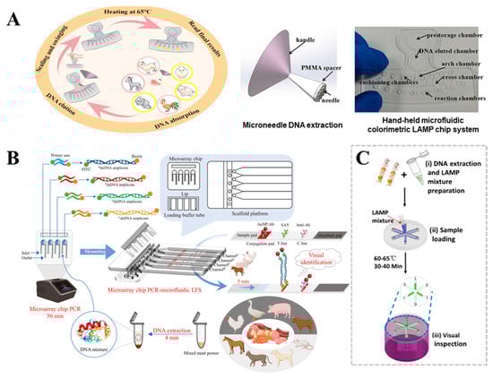 - Xiao, B.; Zhao, R.; Wang, N.; Zhang, J.; Sun, X.; Huang, F.; Chen, A. Integrating microneedle DNA extraction to hand-held microfluidic colorimetric LAMP chip system for meat adulteration detection. Food Chem. 2023, 411, 135508. [Google Scholar] [CrossRef] [PubMed]